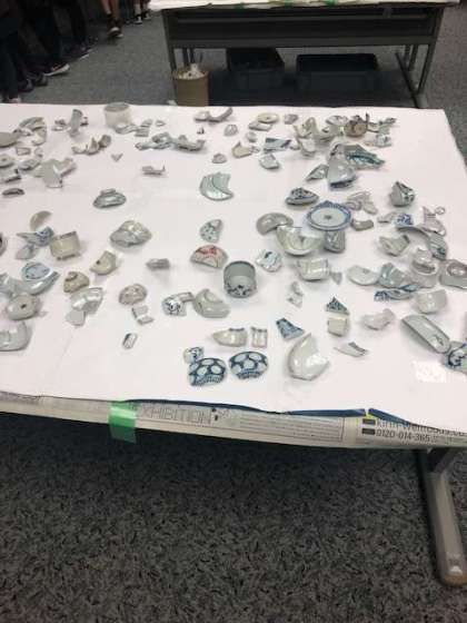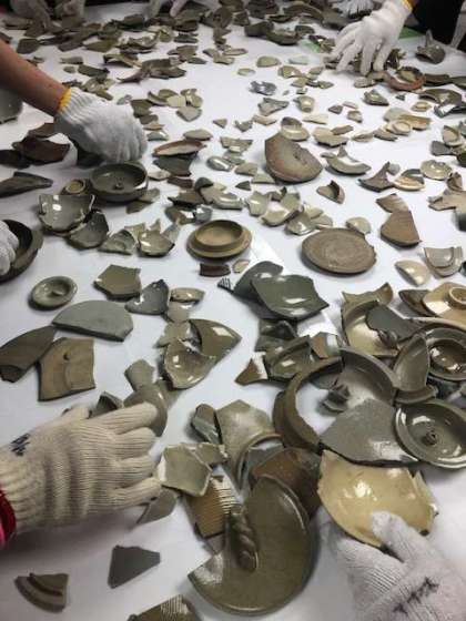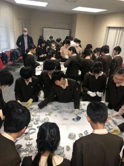土器接合では、たくさんの破片から同じ種類のものを見つけ出し、元の形に戻す作業をしました。これらの破片は、実際に出土された江戸時代もので、丁寧に取り扱いながら組み立てました。