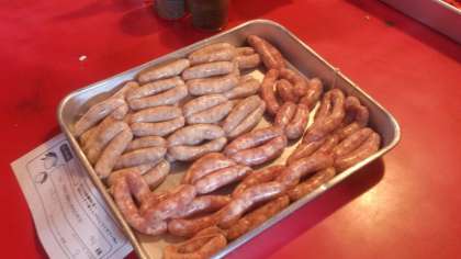 練った豚肉を腸に詰めて、くるくるねじってウインナーのでき上がり!
