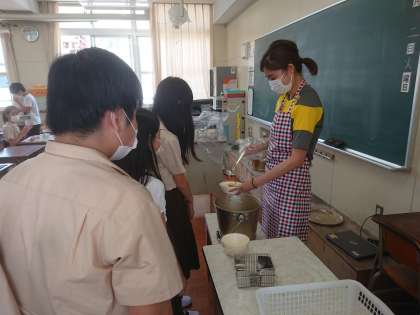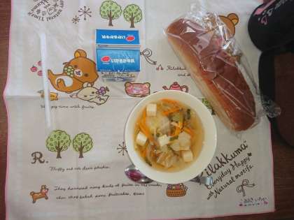 本日のメニューは黒糖パンと五目汁、牛乳です。