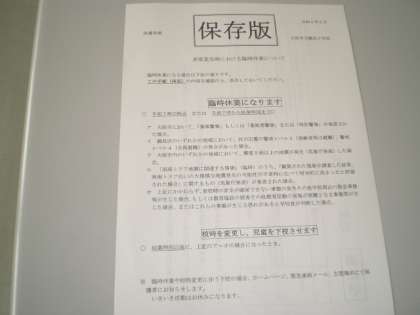 本日、「保存版 非常変災時における臨時休業について」のプリントを配布しています。両面の内容を必ずご確認ください。