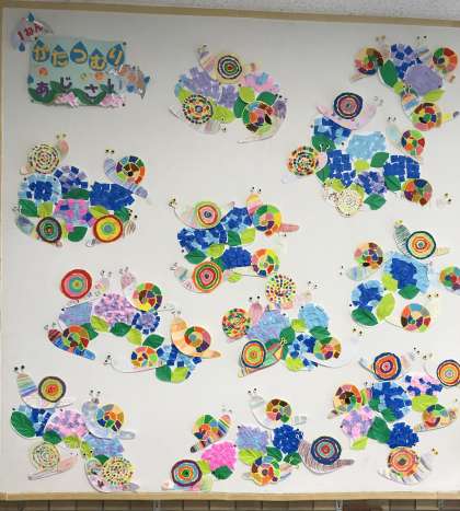 今月の玄関掲示は、共同作品「かたつむり(1年)とあじさい(2年)」です。5月、学習時間が短い中、学校だけでなく、家でも部分を作って完成しました。曇りや雨の日でも、心が晴れやかになる明るい作品になりました。学校にお越しの際には、丁寧に折られたあじさいの花と、46匹のかわいいかたつむりをぜひご覧ください。