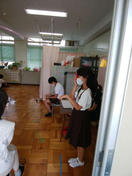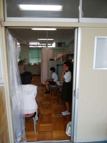 新型コロナウィルス感染防止のため、いつもの遮眼子「しゃがんし」(眼を隠す器具)を使わず、各自のハンカチで眼を覆って視力検査を行いました。