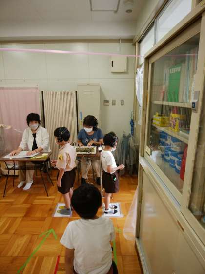 昨日で聴力検査を終了しました。耳にヘッドホーンを付けて音を聴きとっていました。ただし4・6年は聴力検査は行いません。