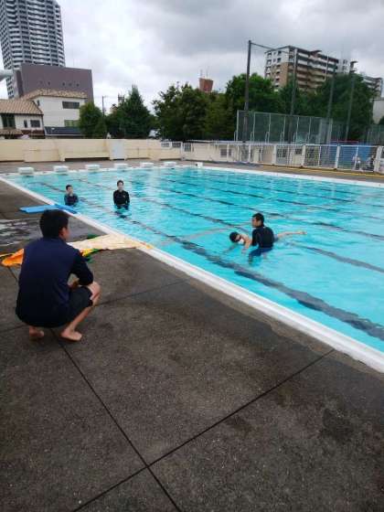 以前に胸骨圧迫法(心臓マッサージ)を行いましたが、今回今までしたことのないプール学習時、人がおぼれている設定で研修しました。指導者は救助、連絡、児童誘導の役割分担をします。応援が駆けつけるまでに、救助、連絡になった指導者2人でプールサイドまでひきあげるということをしました。人をプールサイドに引き上げるのは、とても重くて大変でしたが、頭をまずあげることや、脇の下を持って引き上げるなどのコツを体得することができました。
