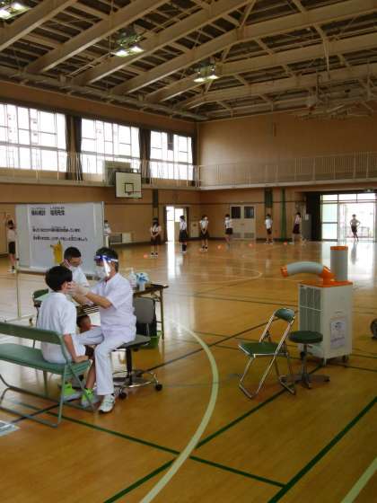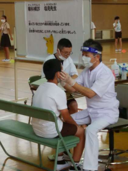 本日、校医の塩見先生に来校していただき、13:30より眼科検診がありました。眼科検診は、検診時間が短いことや密にならないように講堂で行われました。