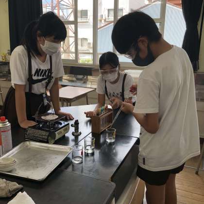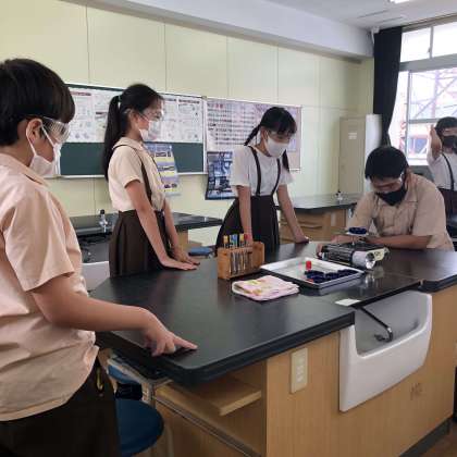 「水溶液の性質」という単元で、5種類の水溶液を区別するために、見た目、におい、蒸発させたときのちがいの3つの視点から調べて表にまとめました。水溶液や器具を班で協力しながら安全に正しく使うことができました。また、友だちとのソーシャルディスタンスに気を付けながら、実験に取り組みました。久しぶりの実験に子どもたちもいきいきとした表情をしていました。