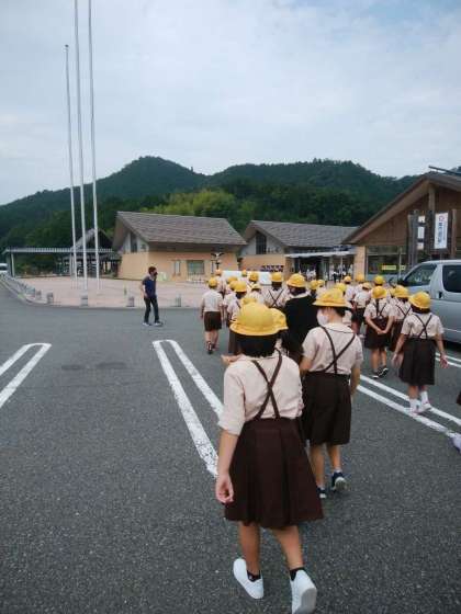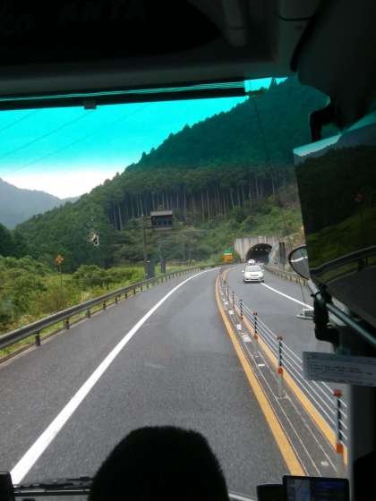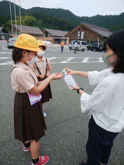 バスは北近畿豊岡道に入りました。但馬の山間部を走り、道の駅「まほろば」に到着しました。バスに乗る前には、しっかり消毒しています。