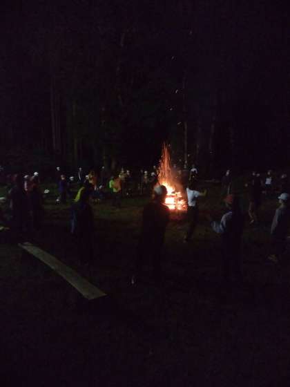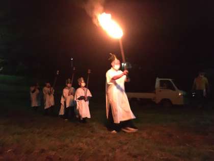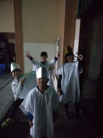 夜にキャンプファイヤーをしました。火の神と火の子が登場し点火しました。歌あり、踊りあり、子どもたちはハイテンションで楽しみました。