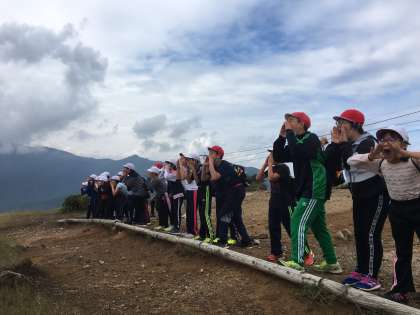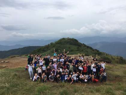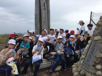 全員頂上に到着しました。山頂からの景色も最高。思わず「ヤッホー」の声がでました。全員元気で記念撮影もしました。