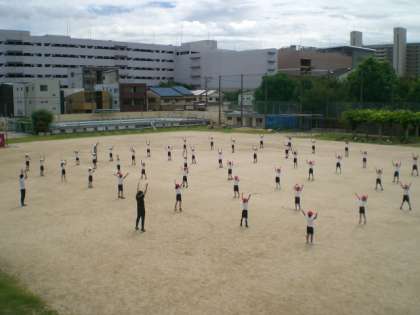 気温も少しですが落ち着き、運動場では2年生が大きく広がって、気持ちよさそうに元気に体操をしていました。