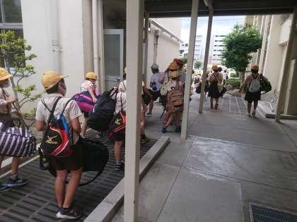 全員元気に鶴見小学校に帰ってきました。これから帰校式です