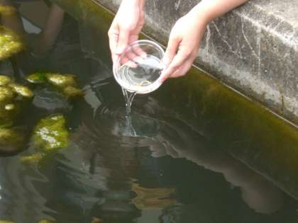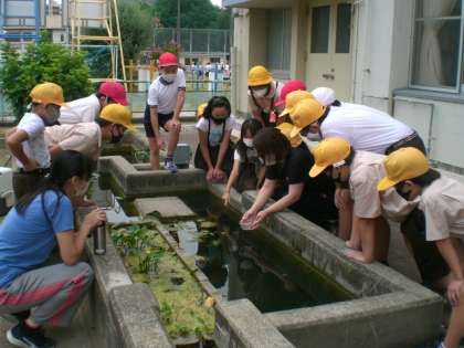 5年生が、理科の学習で飼っていたメダカを学習園の池に放流しました。