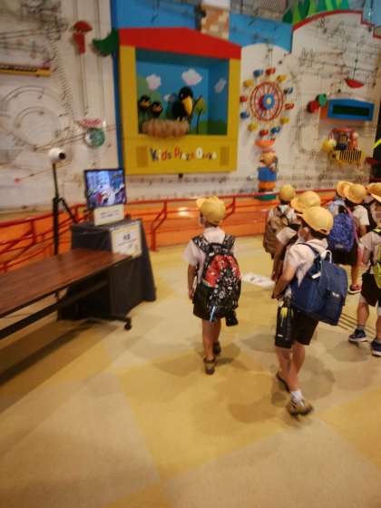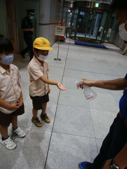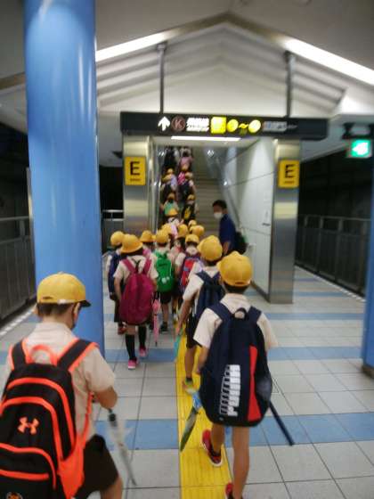 2年生は校外学習でキッズプラザに来ました。電車の中では、みんなマナーよく乗ることができました。館内に入る前には、しっかり消毒と検温をしました。