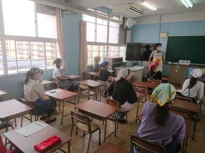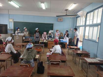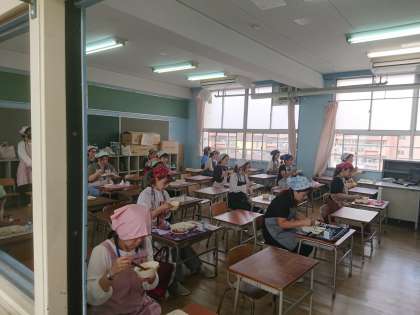 ご希望の保護者の方が給食体験中です。普段なら試食会で和気あいあいと食べるのですが、子どもたちと同じように静かに準備して食べています。