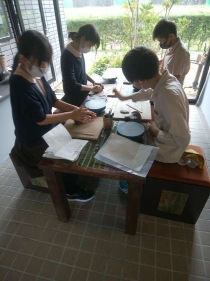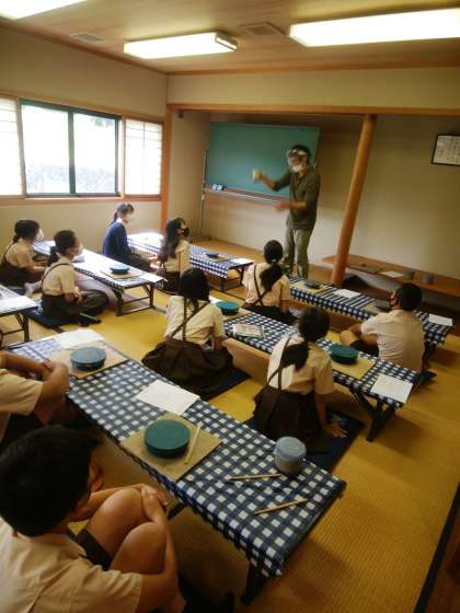 伊賀焼伝統産業会館に到着しました。手指消毒後、会館の方の説明を受けました。