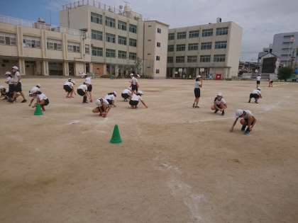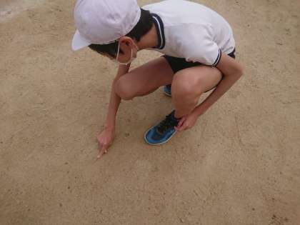 にがりをまいたので運動場に小石が出てきました。去年は集会で拾いましたが、今年は密を避けるため体育の時間に各クラスで石を拾っています。