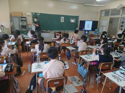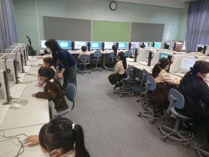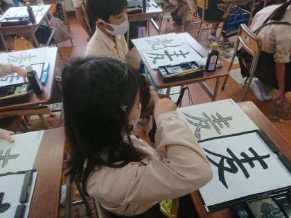 習字をしている学級も。一年生はパソコン室で学習していました。