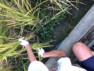 みんなで慣れないくわを使い、安全に気を付けて慎重に刈っていきました。