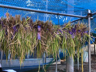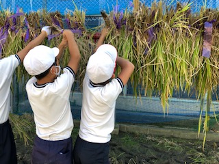 刈り取った稲は乾燥させ、次は脱穀をします。