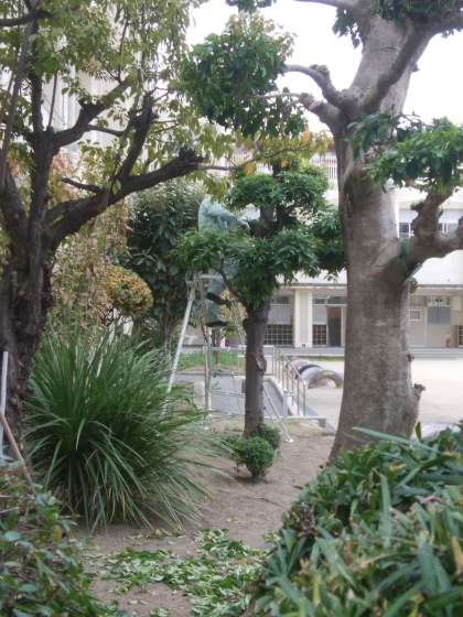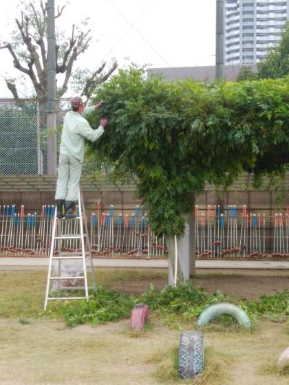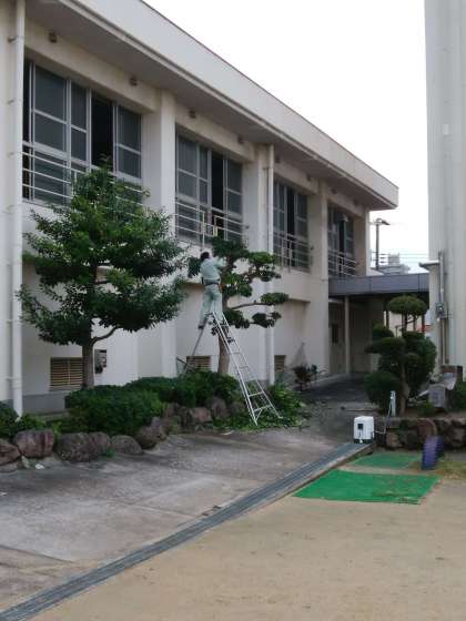 管理作業員さんが、樹木の剪定をしています。学校内には、樹木がたくさんありますが、きれいな樹形になるよう仕上げられています。作業は高い所なので危険がともないます。ケガのないように注意して行っています。