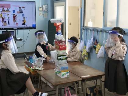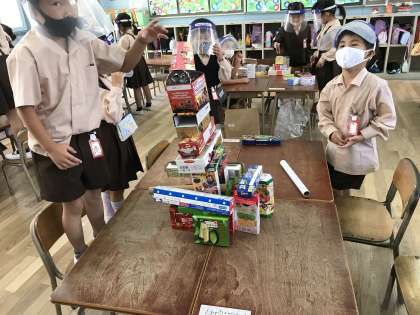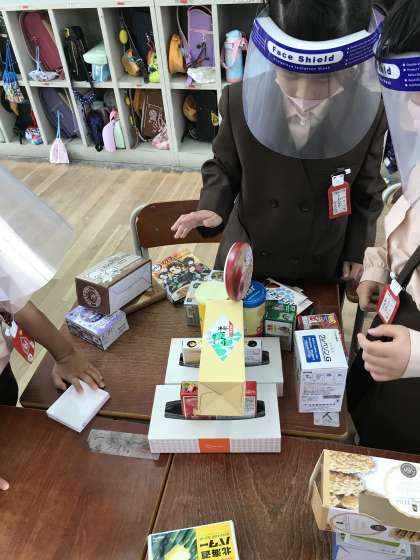 1年生は、箱を使って高く積んだり、転がしたり、城を作ったりする学習をしました。このような活動の中で、立体の性質や特徴を体感していきます。今年、なかなかできないグループ活動も笑顔いっぱいで楽しみました。