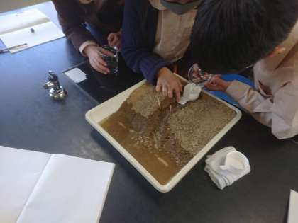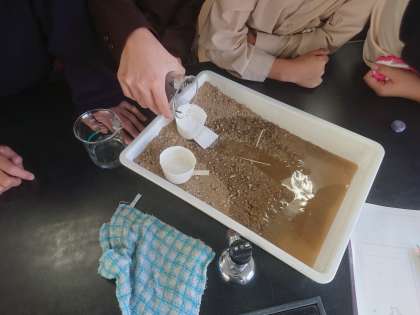 先週運動場で作った川のモデルに水を流して侵食、堆積、運搬を調べます。