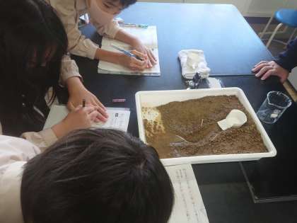 水の量による違いや、カーブで土が削られることに気づいていました。