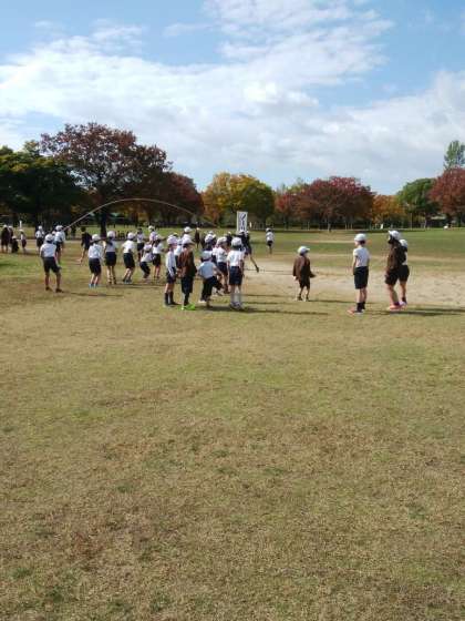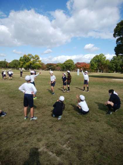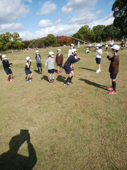 オリエンテーリングから帰ってきた班は、長なわとびをして楽しんでいます。