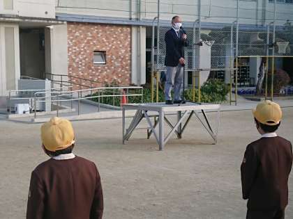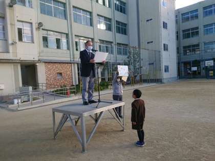 2学期最後の全校朝会、みんなしっかり校長先生の話を聞いていました。いよいよ後一週間で冬休みです。寒いですが手洗い、うがいをして元気に過ごしてほしいです。