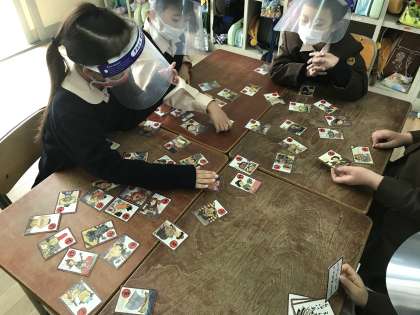 けん玉、こま、たこに続いて、今日はカルタをしました。グループに分かれて、読み手を決めました。読み札の最初の文字を必死で探していました。