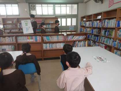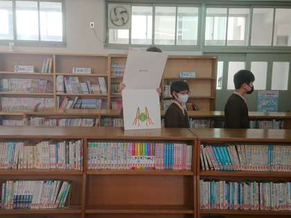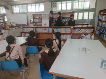 今日からお昼休み図書委員が図書室で読み聞かせをしています。といってもやはり運動場で遊ぶ児童が多いのですが、楽しみにしていた低学年の子が嬉しそうに聞いていました。短い本だったので、後から来た子どもたちのために二回読んでいました。今週一週間を予定しているそうです。横を向いて読んでいるのは対面にならないようにとのことです。