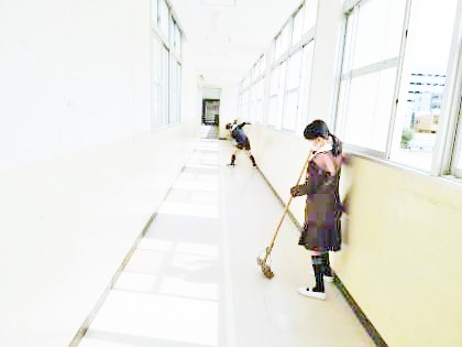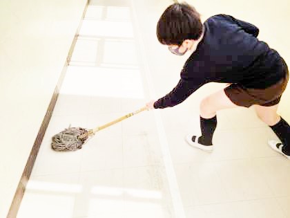 写真は掃除の時間ではなく、給食の配膳の時間です。給食準備の写真を取りに行こうと二階廊下を歩いていると、食缶の汁などがこぼれて汚れているところを当番以外の児童がていねいにふいてくれていました。いつもピカピカの廊下にしてくれてありがとう。気持ちがとてもいいですね。