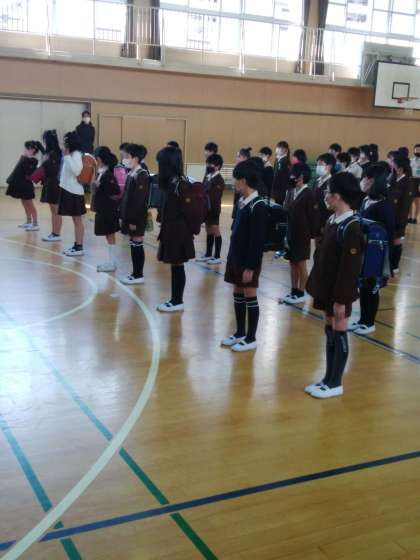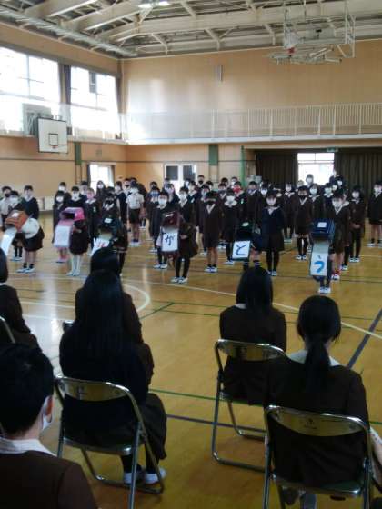 4年の呼びかけは、さすが高学年として迫力がありました。その後に「グッディ グッバイ」を合唱しました。最後にランドセルを使ってひと工夫にも驚かされました。