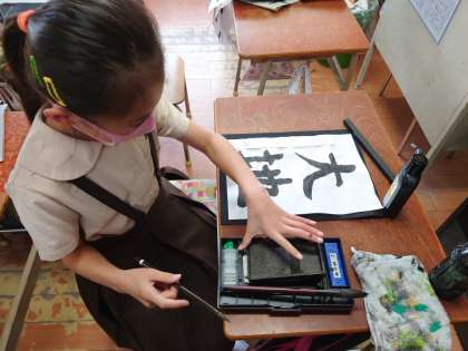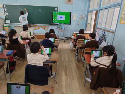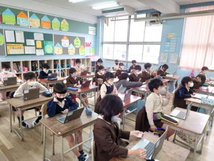 2年生は一人一台タブレットを使って、4年生は習字をしていました。