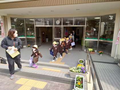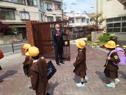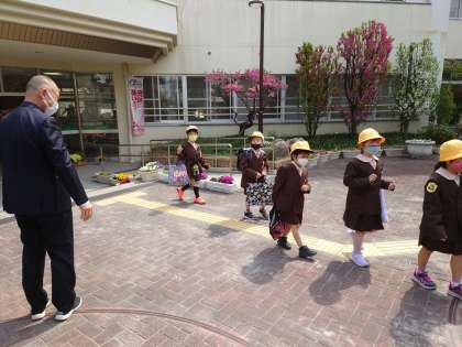 一年生が一足先に下校しました。校長先生とあいさつをして下校しました。