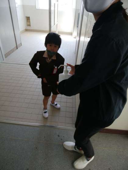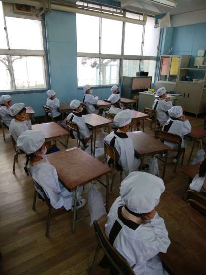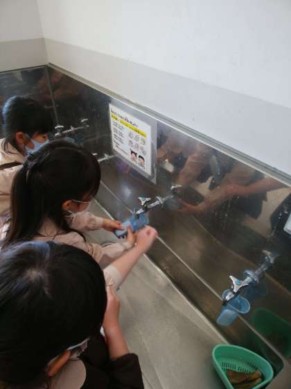 給食前の準備の話の後、手洗いの練習をしましたよ。しっかり石鹸で泡立て手洗いをした後、アルコールで消毒しました。その後、白衣に着がえました。