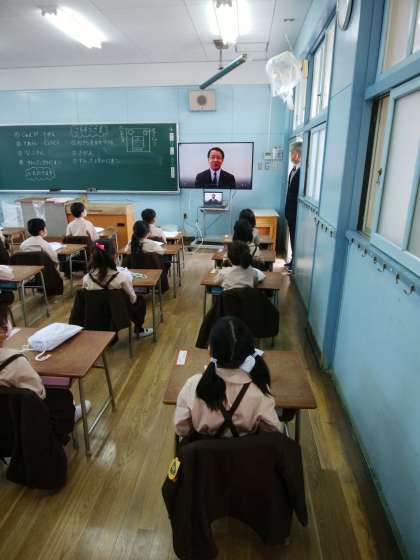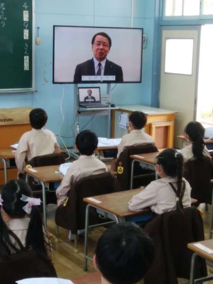 大阪市教育委員会教育長の山本晋次より入学お祝いメッセージがビデオで送られて来ました。1年生は、みんなしっかり聞いていましたよ。