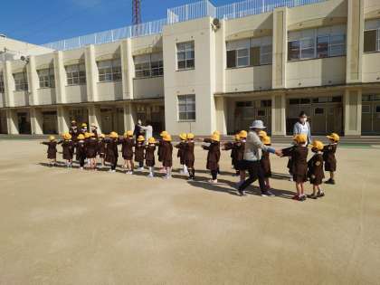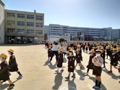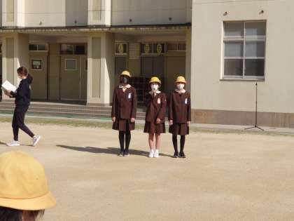 朝会の後、新一年生を迎える会を行いました。一年生が前に移動して始まりました。