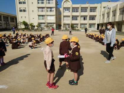 児童会が進行し、お祝いの言葉の後、2年生からアサガオの種のプレゼントがありました。