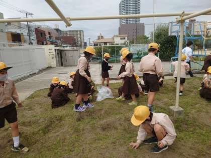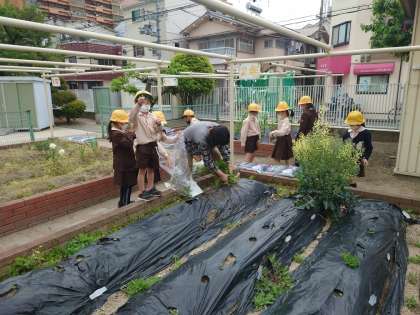 午前中は雨も降らなかったので、2年生が学習園で草抜きをしていました。野菜を育てる準備をみんなでしていました。
