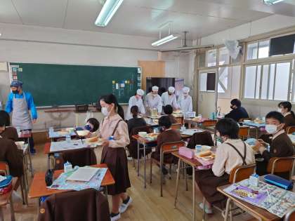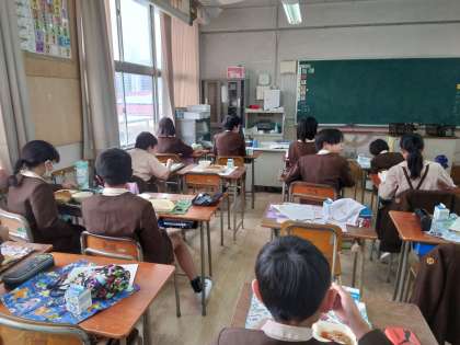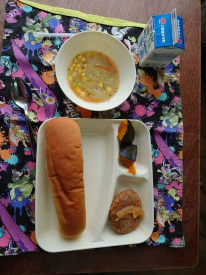 煮込みハンバーグです。鶴見小学校では現在マスクをとったら話さないよう指導しているので、どのクラスも静かに食べています。
