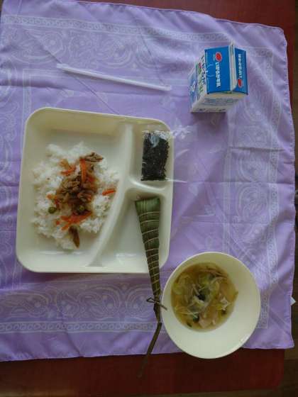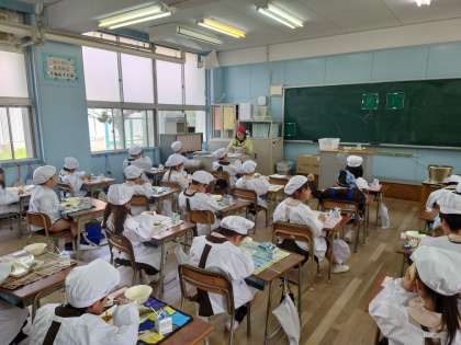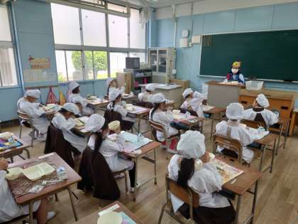 今日の給食はご飯でした。一年生は少し早めに取りに行き、1時10分を目指して食べていました。