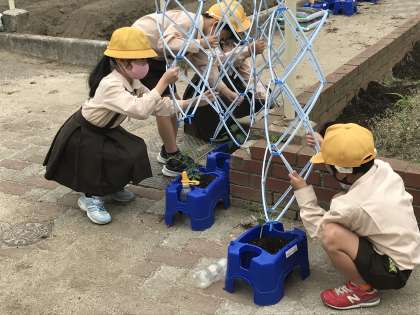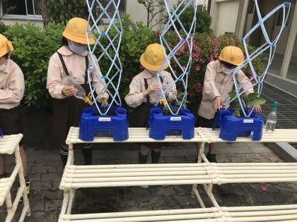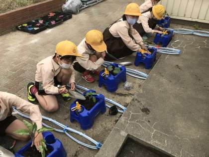 ミニトマト、なすび、きゅうり、ピーマンの中から好きな野菜を選び、自分の植木鉢に苗を植えました。また、毎日の世話が始まります。夏には、おいしい野菜を家に持って帰る予定です。