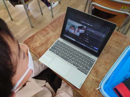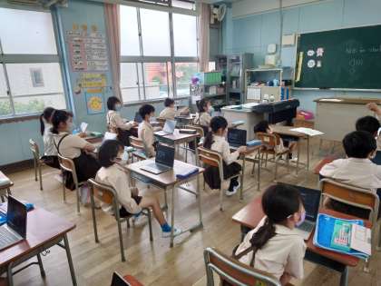 タブレットを使っていました。NHKforschoolを自分たちで視聴して、その後teamsで双方向通信の練習をしました。前回したので、とてもスムーズでした。