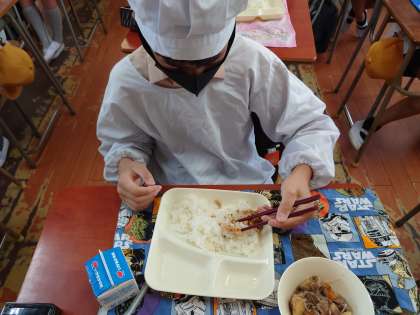 ごまかかいためは、たけのことかつおぶしをまぜたものでご飯にかけて食べます。