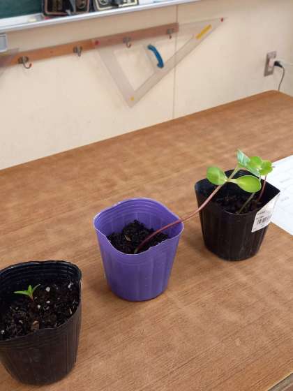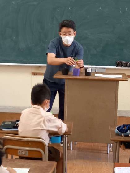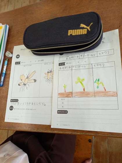 1組は、観察している「ホウセンカ」「ひまわり」「マリーゴールド」の大きさの測り方などを学習し、プリントにかきこんでいました。