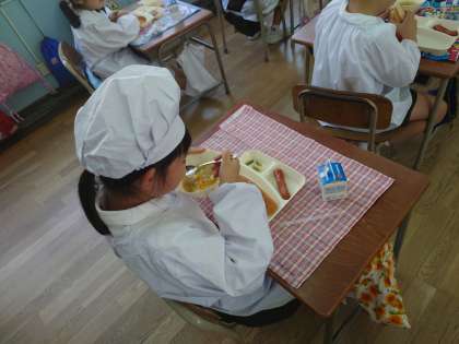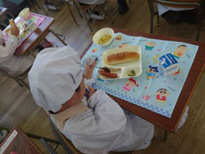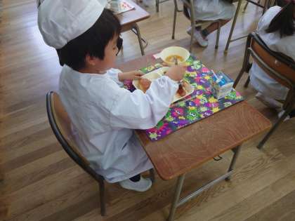 一年生も美味しそうに食べていますが、ウィンナーは切ったり、乗せたりするのが大変そうでした。頑張って食べてくださいね。