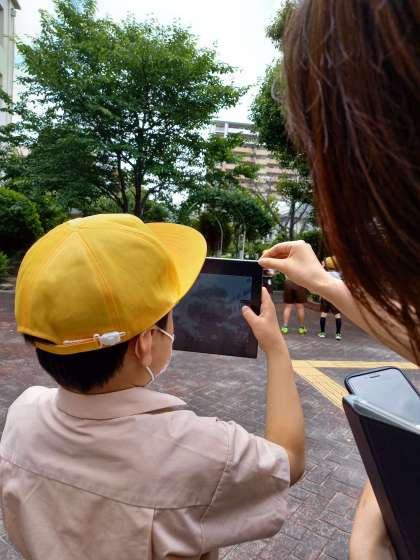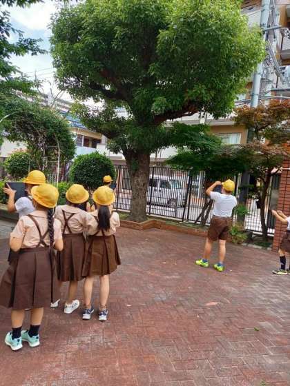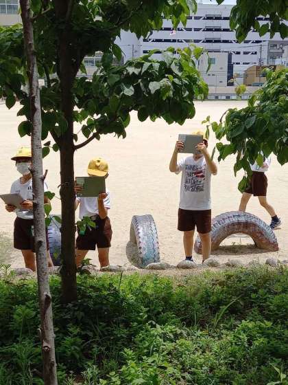 2組も木の絵を描くために、タブレット端末を使って写真を撮っていました。