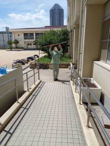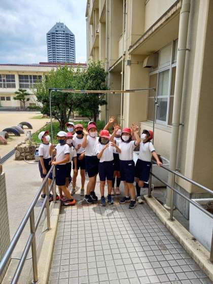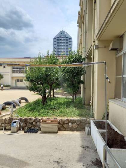 管理作業員さんが、ミストシャワーを設置してくれました。早速体育が終わった5年生が浴びていましたよ。