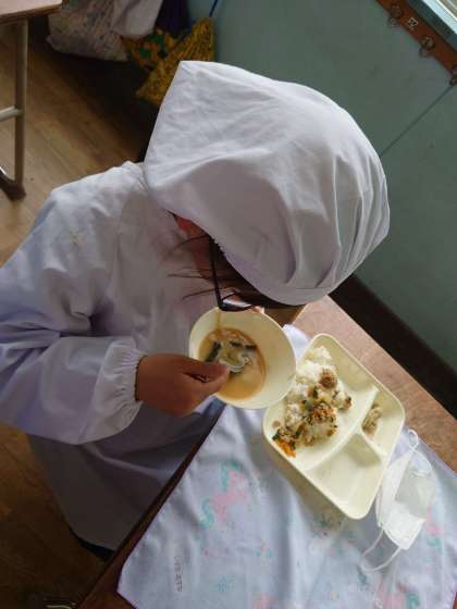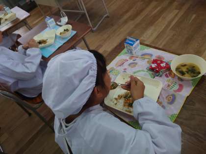ご飯です。豚ひき肉とニラのそぼろどんぶりです。
